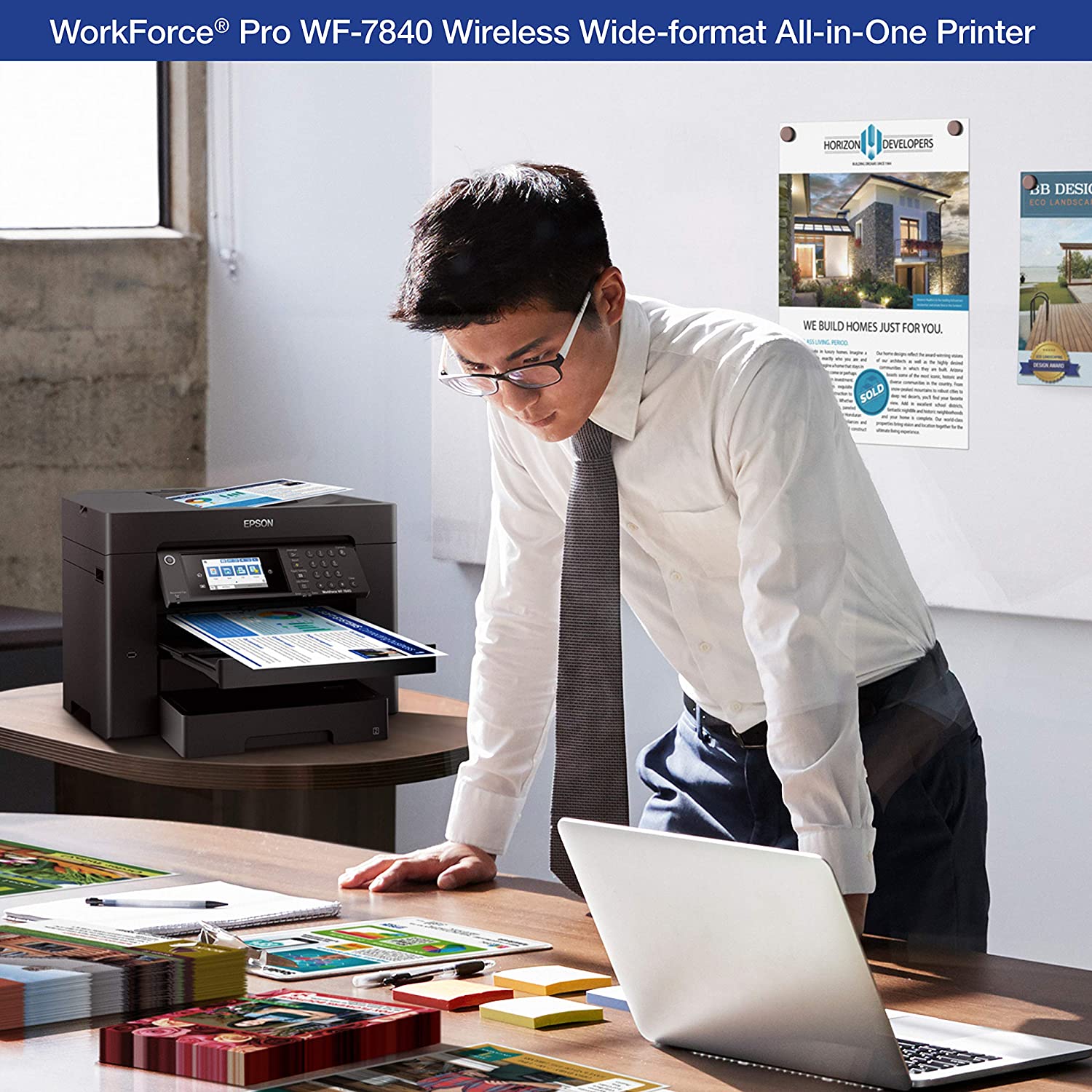 Supercharge workplace efficiency and productivity with the ultra fast WorkForce Pro WF-7840. Offering high-speed wide-format printing, this reliable all-in-one consistently delivers sharp, professional-quality, prints using innovative PrecisionCore Heat-Free Technology and vivid DURABrite Ultra inks. Built from the ground up to meet the demands of fast-paced businesses, the WF-7840 tackles a variety of tasks with wide-format printing up to 13" x 19", auto 2-sided print, copy, scan and fax, a 50-sheet rear tray, and a large, 500-sheet paper capacity. Convenient and easy-to-use, this complete duplex solution offers an abundance of features for simplified operation and navigation, including a 4.3" color touchscreen and wireless setup using mobile devices (1).This product uses only genuine Epson-brand cartridges. Other brands of ink cartridges and ink supplies are not compatible and, even if described as compatible, may not function properly.† Black and color print speeds are measured in accordance with ISO/IEC 24734. Actual print times will vary based on factors including system configuration, software, and page complexity. For more information, visit our official site.1. Requires Epson Smart Panel app download and a compatible smart device. Data usage fees may apply. For more information, please visit our official site.2. Most features require an Internet connection to the printer, as well as an Internet- and/or email-enabled device. For a list of Epson Connect enabled printers and compatible devices and apps, visit our official site.3. Wi-Fi CERTIFIED; level of performance subject to the range of the router being used. Wi-Fi Direct may require printer software.4. Based on comparing manufacturers’ reported TEC values of the best-selling, similarly featured color laser printers priced similarly (USD) or less with print speeds of 40 ppm or less as of February 2020.5. For convenient and reasonable recycling options, visit our official site.6. SmartWay is an innovative partnership of the U.S. Environmental Protection Agency that reduces greenhouse gases and other air pollutants and improves fuel efficiency.