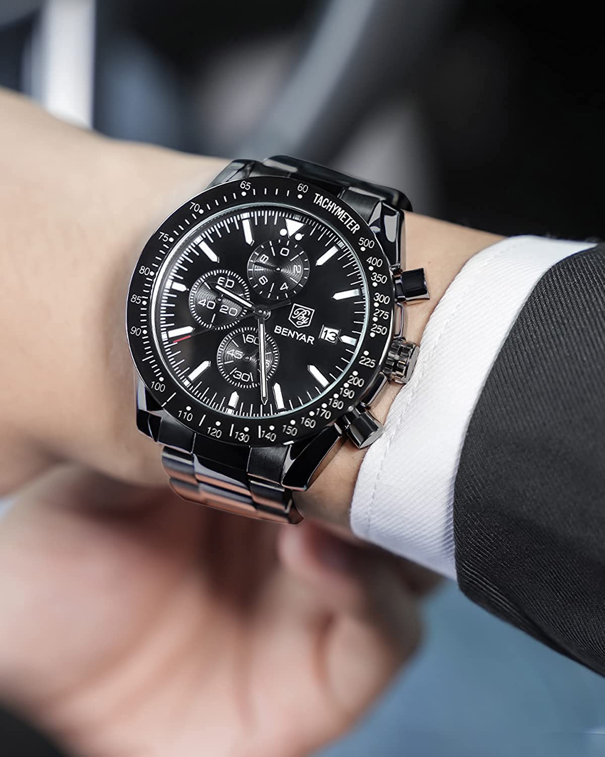 - ⌚ ELEGANT DESIGN: BY BENYAR offers a wide range of stylish luxury wrist watches specially crafted for men. The watch comes with 100% strong glass, black dial and tachymeter topring. The genuine stainless steel band with width 2.2cm and length 22cm give the watch a classy look. It is a multi-function chronograph with three sub-dial for second, minute and hour.