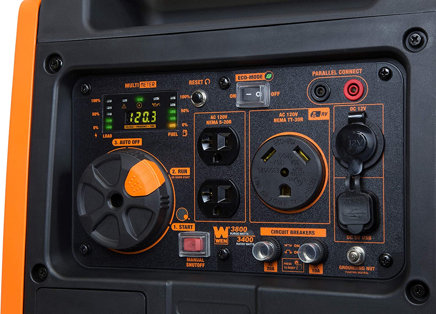 Remember when you had clean and quiet portable power? The WEN 3,800 Watt Inverter Generator produces clean energy free of voltage spikes and drops without making all of the noise of a regular generator. Generate up to 3800 surge watts and 3400 rated watts of power. Our 212cc 4-stroke air-cooled OHV engine operates at an extremely quiet 57 decibels at quarter load, about as quiet as a window air conditioner or the average conversation. This limits its invasiveness while hunting, camping, tailgating and restoring back-up power. The WEN 3800W Inverter Generator is also equipped with fuel shutoff. This feature turns off the flow of fuel, allowing the generator to use up the remaining fuel from the carburetor before automatically shutting down. This helps fight the build-up and blockages caused by stagnant fuel inside of the carburetor, minimizing maintenance while prolonging the unit’s lifespan. Designed to mirror a pure sine wave, this generator limits total harmonic distortion to under 0.3 percent at no load and under 1.2 percent at full load, making it safe enough to run laptops, cellphones, monitors, tablets and other vulnerable electronics. The lightweight design along with the built-in wheels and folding handle make for easy portability while the ultra-efficient 2.2-gallon tank provides over 8.5 hours of half-load run time. Our fully-packed panel comes equipped with two 3-prong 120V standard household receptacles, one AC 120V 30A NEMA TT-30R receptacle, one 12V DC receptacle, two 5V USB ports and an easy-to-read digital fuel and load display. Maximize fuel economy by engaging the Eco-Mode switch. This feature allows the generator's engine to automatically adjust its fuel consumption as items are plugged into and unplugged from the panel, preventing the usage of unnecessary gasoline. The oil access cover makes for easy oil changes. Need more energy? Easily link up two WEN inverter generators using a WEN GNA50i 50-Amp 6000-Watt Parallel Connection Kit (sold separately) in order to share wattage between multiple units. Low-oil and low-fuel automatic shutdown, indication lights, and overload protection safeguard both your generator and your electronics from damage. The included spark arrestor allows for legal use in national parks and campgrounds. And because this is a WEN Product, your inverter generator comes backed by a 2-year warranty, a nationwide network of skilled service technicians and a friendly customer helpline. Remember when your generator powered your electronics safely and quietly? Remember WEN.