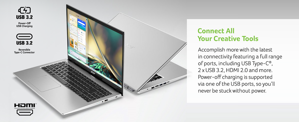 It's all about the innovation. Acer products are designed for your needs and accessibility with powerful features fit for your lifestyle. The Aspire 5 packs a lot of power into the portable design to suit the multi-tasking needs of you and your family. Break the boundaries of performance every time you fire up Acer’s new Aspire 5, which features the latest 11th Gen Intel Core i3 processor and faster Wi-Fi 6 connectivity for an awesome computing experience. This finely tuned design offers unmatched speed and reliability, making it ideal for things like photo and video editing, gaming, and work-related functionality. The narrow-bezel design provides plenty of screen so you can focus on what's in front of you, while the Full HD IPS display ensures crisp, true-to-life colors! With Windows 11 Home in S mode, you’ll experience fast start-ups, a familiar yet expanded Start menu, and great new ways to get stuff done. And with automatic updates enabled, you get all the latest features and security hassle-free. Work, play and share all in one device!
