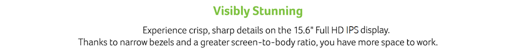 • Visibly Stunning: Experience sharp details and crisp colors on the 15.6" Full HD IPS display with 82.58% screen-to-body, 16:9 aspect ratio and narrow bezels
