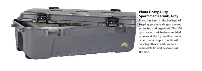 • PLANO SPORTSMAN STORAGE TRUNK WITH WHEELS: Store or take your tools, hunting gear, ammunition, camping supplies, and more on the go with the Plano Sportsman Trunk with Wheels. With a 108-quart total capacity, the possibilities are endless.