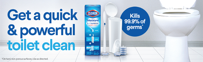 Clorox Toilet Wand disposable toilet Cleaning system is a convenient way to a quick clean toilet. The starter kit contains one wand, 6 original refills, 10 Rainforest rush scented refills and 1 storage Caddy to get you started on a deeper clean. Each disposable head is preloaded with Clorox cleaner with 4x the powerful scrubbing action to clean tough stains, kill germs, remove rust, calcium and limescale while it disinfects and deodorizes with ease. Based on comparative lab tests, the toilet wand cleans better than a brush. The sponge like cleaning head is shaped so that you can get into every nook and cranny needing cleaning and germ control while killing 99.9% of germs like Staphylococcus aureus, Salmonella enteria, rhinovirus type 37 and Influenza A. This all in one system is designed so that you get a brand new cleaning sponge every time you clean without having to touch a yucky brush. Just click your way to a cleaner toilet with the Clorox Toilet Wand disposable toilet Cleaning starter kit.