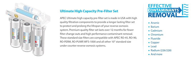 APEC Ultimate high capacity pre-filter set is made in USA with high quality filtration components to provide a longer lasting filter set to protect and prolong the lifespan of your reverse osmosis system. Premium quality filter set lasts over 12 months for fewer filter change outs and high performance contaminant removal. These standard size filters are 10" and compatible with all standard size under counter RO systems. 1st Stage: High-Grade 10" high-capacity polypropylene sediment filter -removes dust, particles, and rust. 100% pure polypropylene depth filter with exceptional dirt-holding capacity translates to longer life and fewer change-outs than existing string-wound or resin-bonded filters. 2nd and 3rd Stage: Premium Extruded Carbon Block 10" -gets rid of unpleasant chlorine, tastes, odors, cloudiness and colors. Also removes VOCs and other common chemicals from the water. APEC's extruded carbon block filters consist of activated carbon particles fused into a uniform block with enhanced adsorptive capacity and efficiency. Unlike granular activated carbon (GAC) filters, these extruded carbon block cartridges will not channel or bypass due to the extreme uniformity of their extruded activated carbon core. Compatible for APEC RO-45, RO-90, RO-PERM, RO-PUMP and all other standard size under counter reverse osmosis systems. About APEC For over 17 years, APEC has been an industry leading manufacturer who specializes in high performance RO systems. As the original manufacturer, we have dedicated a knowledgeable and sincere team that is committed to providing customer satisfaction in hopes to bring many years of enjoyment and good health for you and your family.