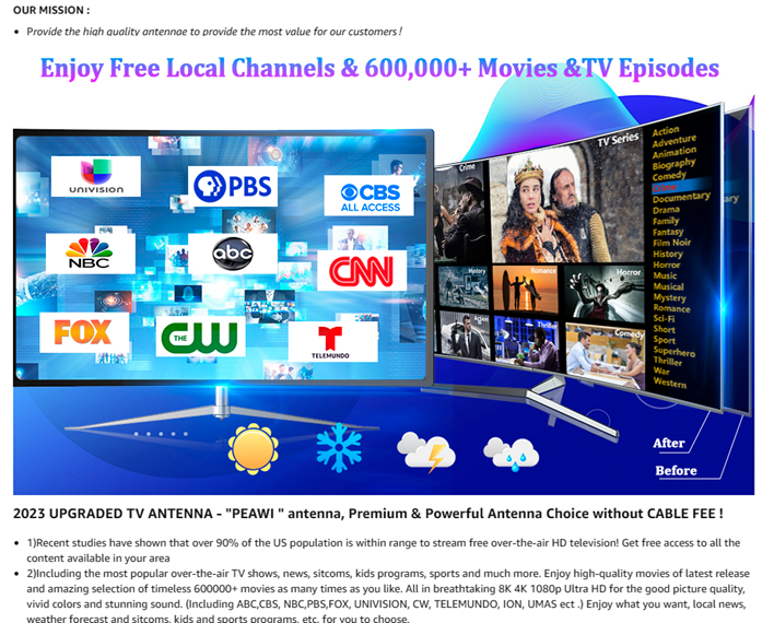 • ?▷【LIFETIME FOR FREE ALL LOCAL CHANNELS】- Say goodbye to the bill! BEYOND A PURCHASE! Enjoy hundreds of 0 COST channels with no pixelation, Brings scenes to life ! Digital HDTV Antenna start to access the news, sitcoms, kids and sports programs! TV antenna can receive channels including ABC,CBS, NBC,PBS,FOX, UNIVISION, CW, ION, UMAS ect . ❗Reminder: Re-scan channels after moving the antenna.
