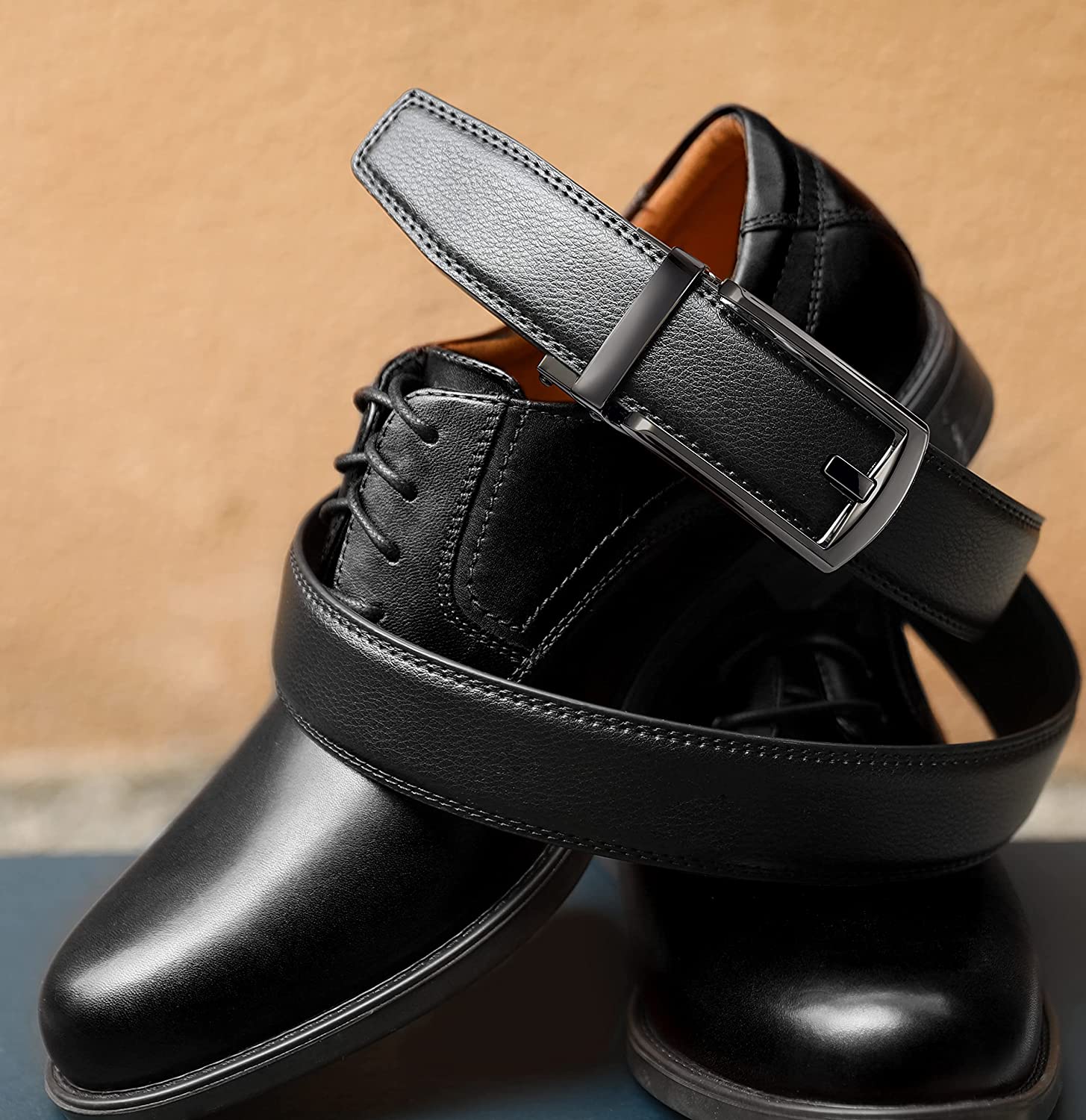 • EASY TO USE - Slide the brown dress belt for men into the sliding buckle, and the holeless belt auto-locks. Lift the automatic buckle, and pull the mens belts leather to release. Simple, smooth, and sleek!