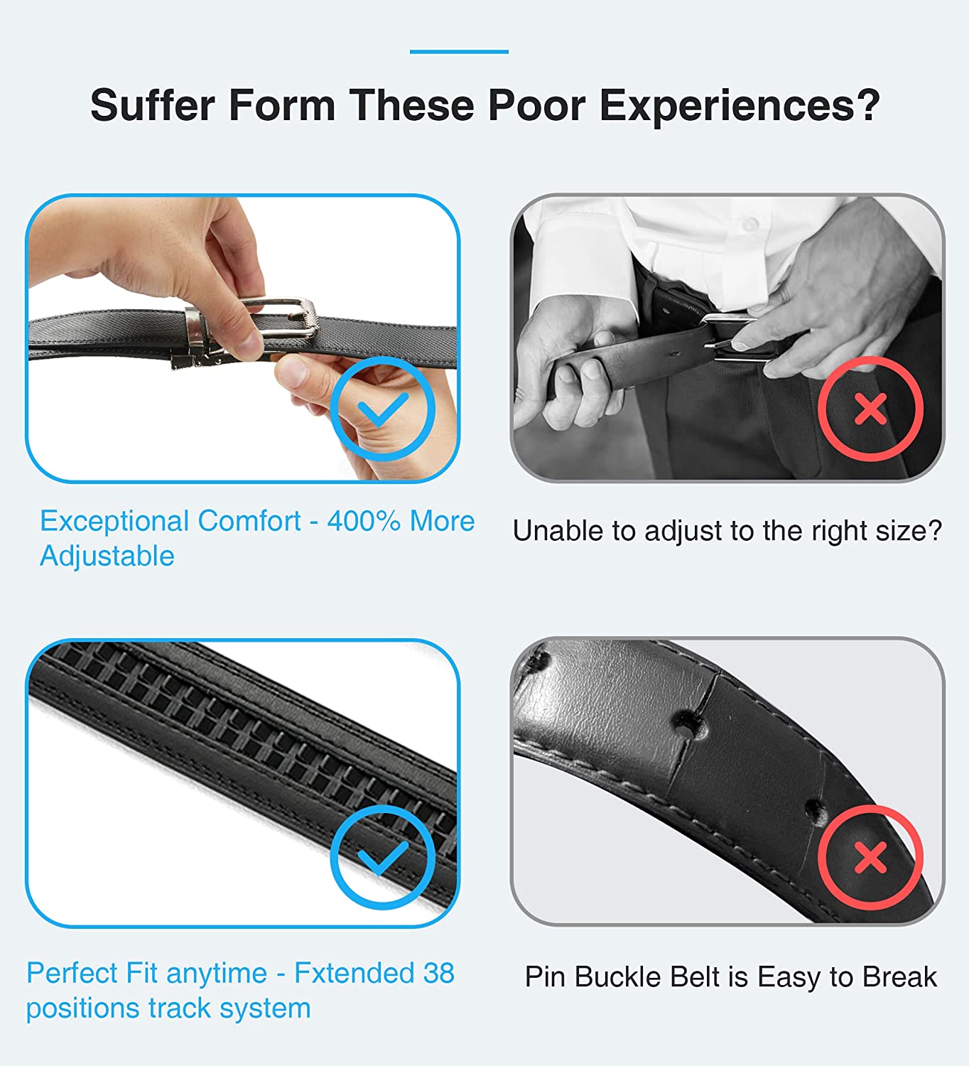 • FOR EXACT FIT - Rachette belt allows for up to 1/4" adjustments for perfect fit everywhere. The comfort click belt features an easily removable buckle that allows you to cut the belt to your ideal size.