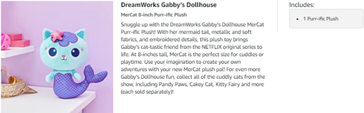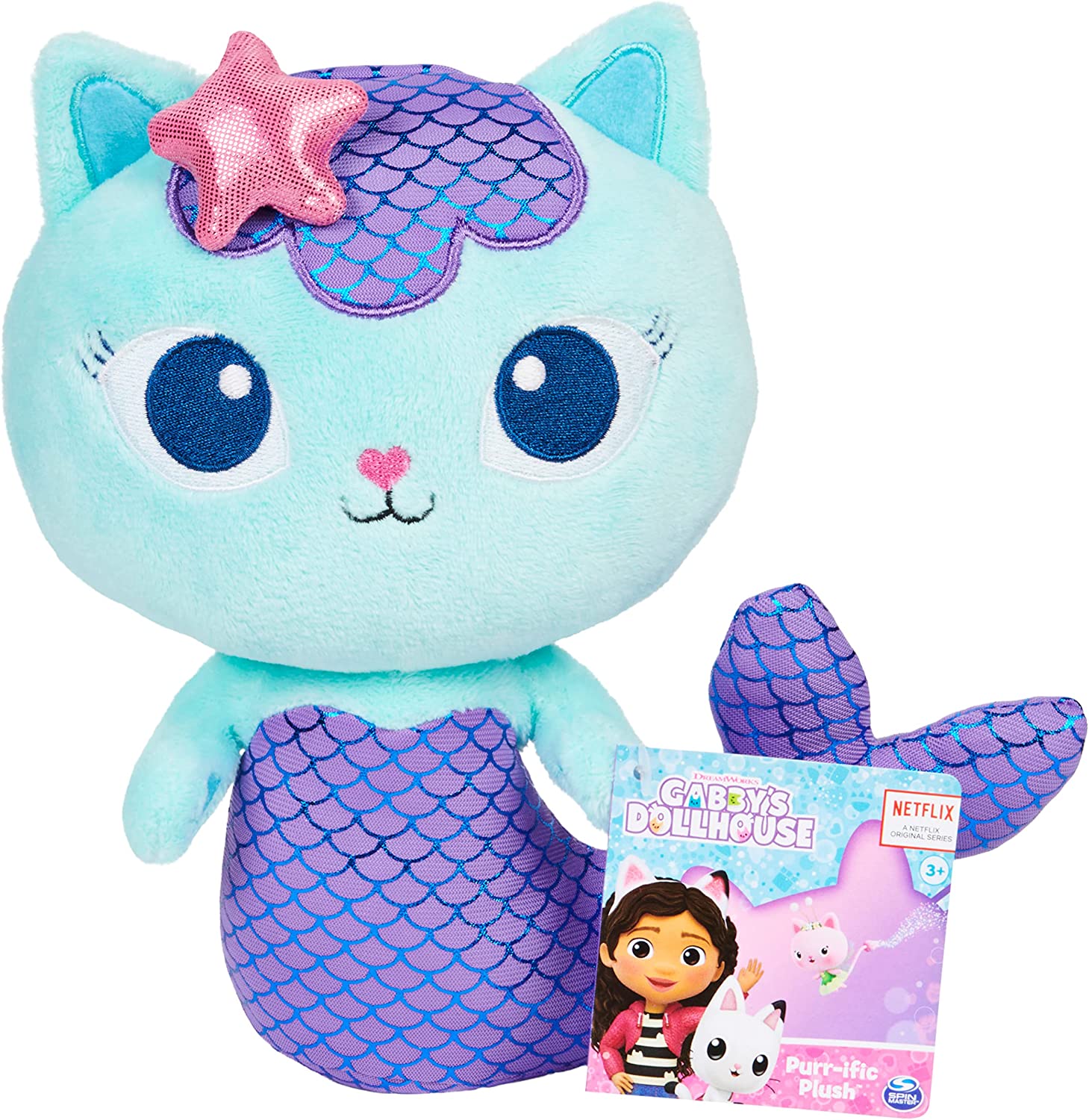 Bring home the irresistible kitty characters from Gabby’s Dollhouse with the Purr-ific Plush! This adorable MerCat plush toy features both metallic mermaid fabric and super soft fabric, and embroidered details, bringing Gabby’s cat-tastic friend to life. At 8-inches tall, MerCat is the perfect size for cuddles or playtime, at home or on-the-go! From Gabby’s best pal Pandy Paws’ signature pointy ears, Cakey Cat’s sweet sprinkle details, Baby Box Cat’s polka dot dress and more, each Purr-ific Plush stuffed animal (each sold separately) looks just like the character from the NETFLIX original series. Kids can collect all of the cuddly soft toys from the show and use their imagination to create their own adventures with their new plush pals. Snuggle up with the Gabby’s Dollhouse MerCat Purr-ific Plush!