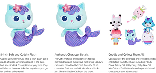 • AUTHENTIC DETAILS: This MerCat cute stuffed animal features realistic details, metallic and super soft fabric and embroidered details – she looks just like Gabby’s cat-tastic friend from the show!