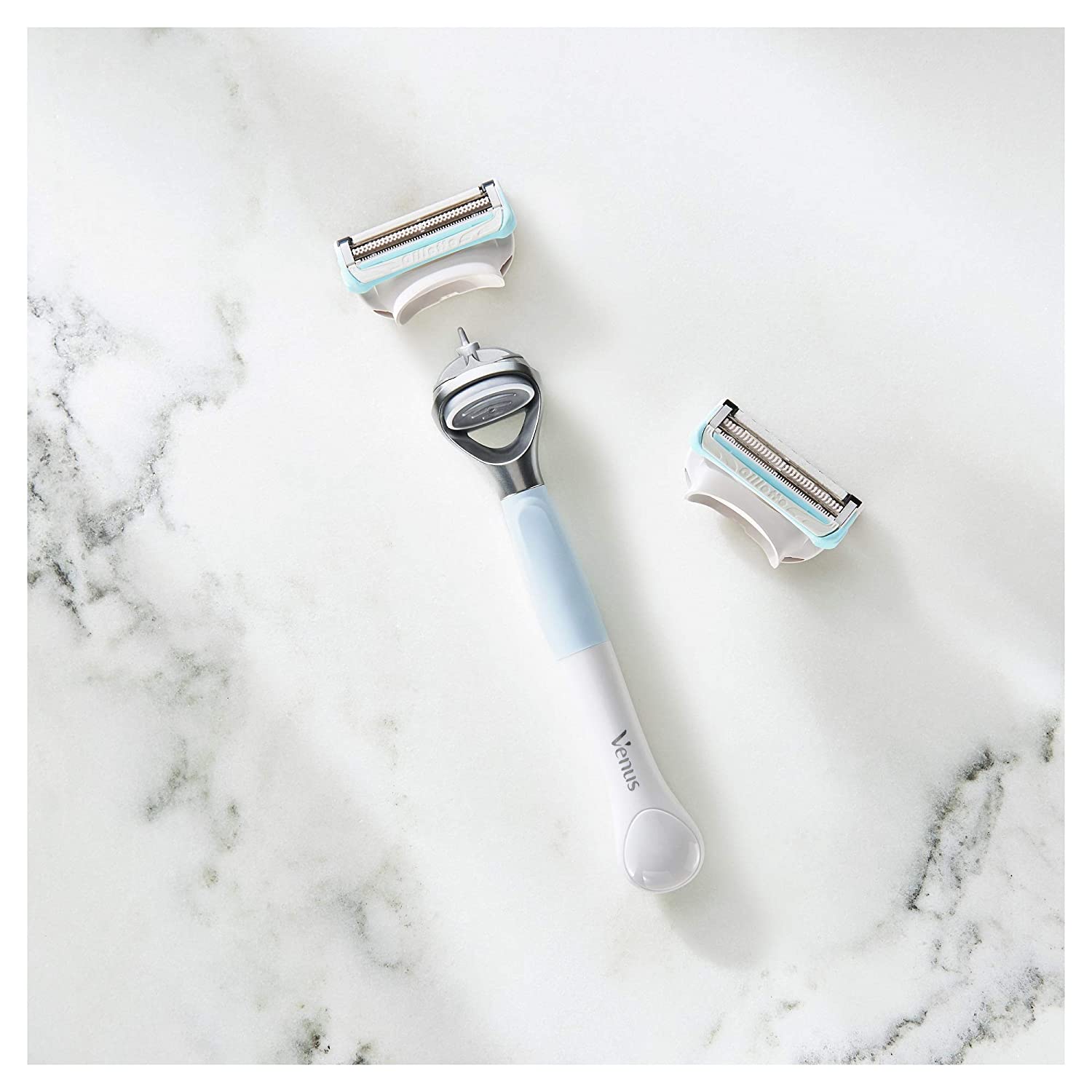 Venus's pubic hair and skin blades are specifically designed to help protect pubic skin from shave irritation. They have a patented irritation defense bar and optimally spaced blades that allow the blades to cut hair while barely touching the skin. Also, the razor refills come equipped with a precision Trimmer on the back of the blades to help with tricky areas.