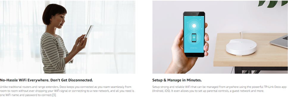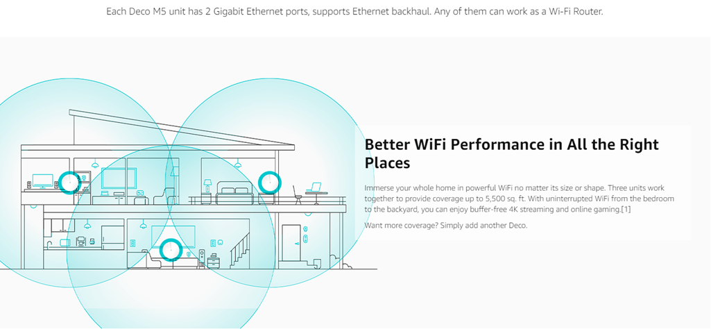 • Better coverage than traditional Wi-Fi routers: Deco M5 uses 3 units working seamlessly to create a mesh network that can cover homes up to 5,500 square feet. No dead zone anymore