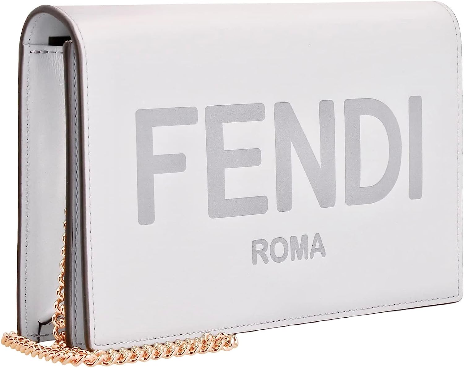 The Fendi Roma Ghiaia Wallet on Chain is beautiful and luxurious. The off-white soft leather is enhanced by the bold Fendi logo across the front. Carry by hand or over the shoulder by a delicate gold chain. Flap opening reveals a main compartment with credit card slots and a zippered pouch. Items stay secure with a snap closure. A beautiful white handbag perfect for everyday, weddings, an evening out and more. This timeless piece will bring joy for years to come.