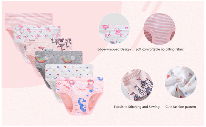Material:100% cotton, keep her cool and comfy all day, they are ideal for everyday wearComfortable double-layer covered waistbandThe elastic leg openings make them easy to wearYour little one will adore the colorful graphics and everyday comfort of this 6-pack of girls' underwearUnderwear is designed for the safety and health for kids,we are attention to the detail ,simple but comfortable,ensure your children move freelyPackage included: pack of 6 pieces of Girls Panties