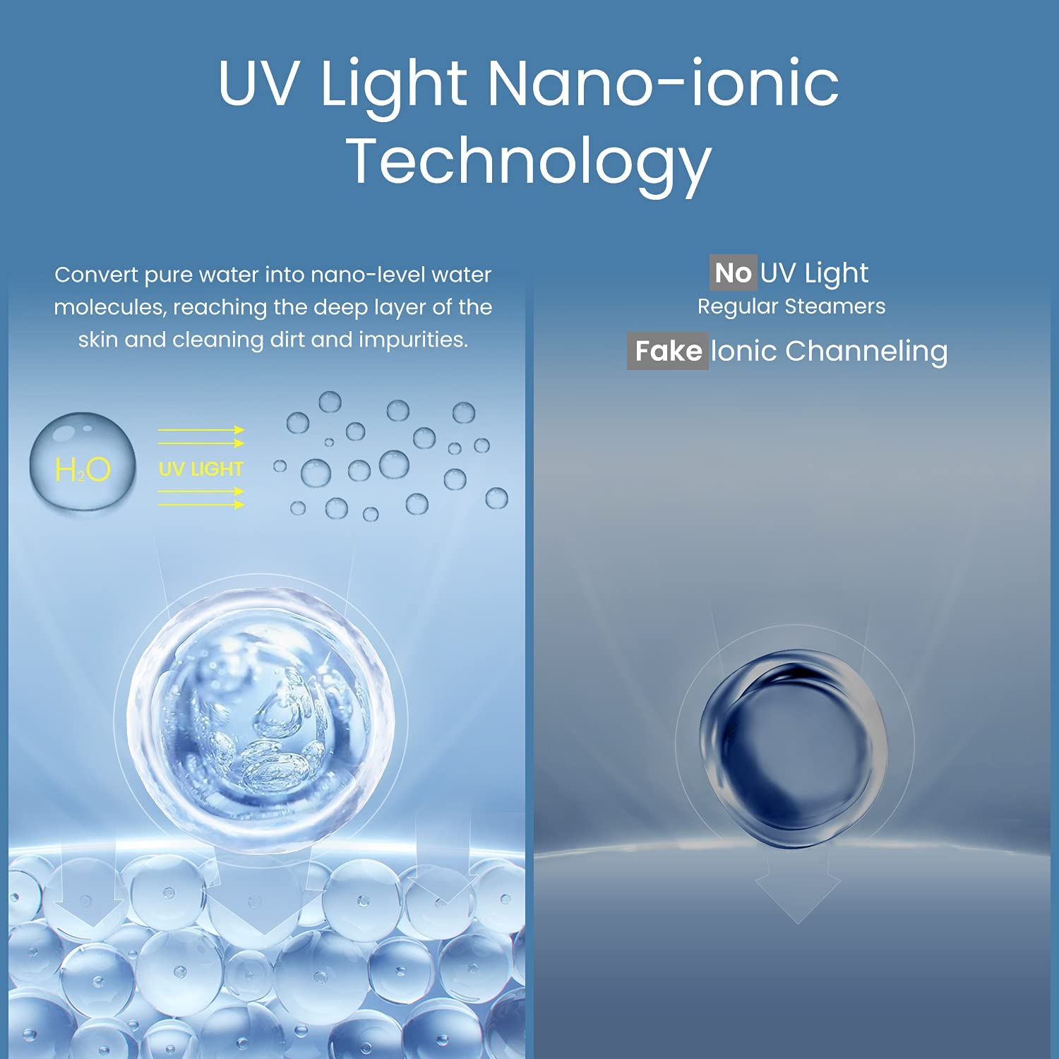 • Nano-Ionic Steam Purify Light --- A new nano-ionic facial steamer is equipped with a purify light inside, which can convert 100% pure water into nano-sized water molecules, reach your skin with purest and most effective condition. Help you clean the dirt and impurities of your skin
