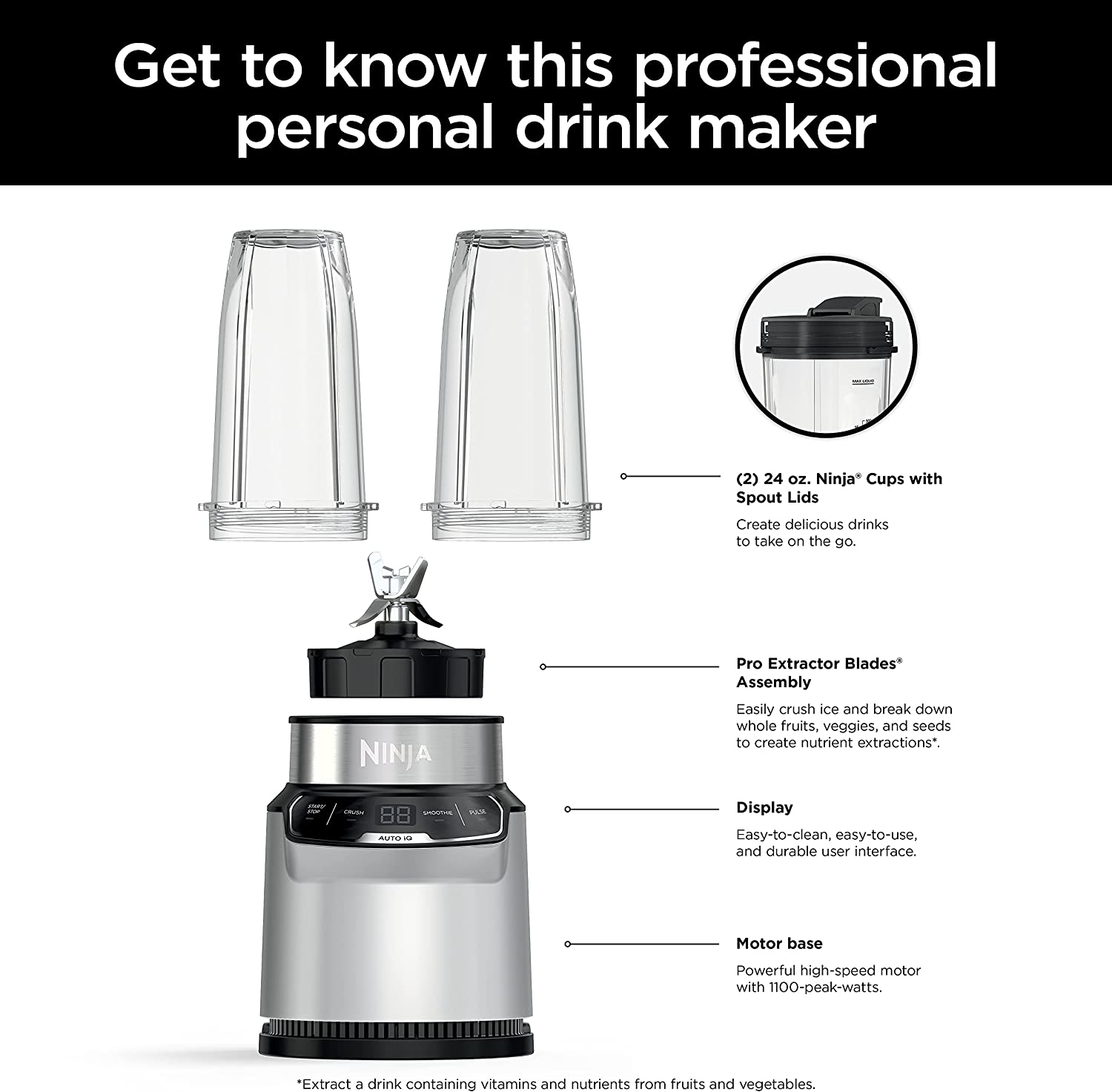 | Included Components | Inspiration Guide with 20 Recipes, 1100 Peak Watt Motor Base, (2) Spout Lids, Pro Extractor Blades Assembly, (2) 24 oz. Single Serve Cups, Instruction Booklet |