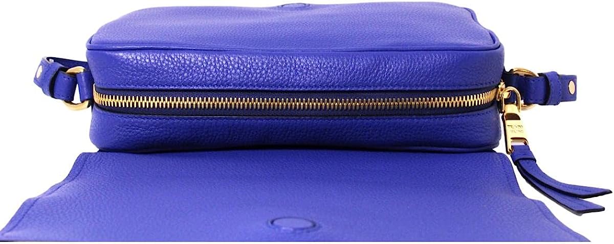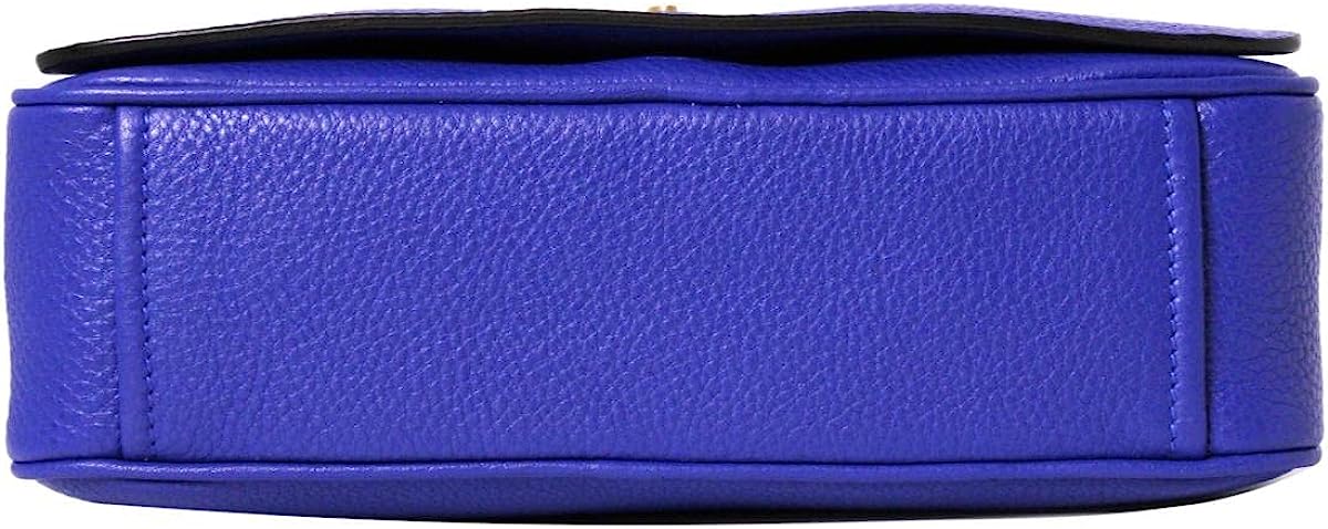 Color: Royal Blue. Material: Calf Leather. Gold-tone Hardware. Magnetic flap fastening. Zipper fastening. Interior black jacquard lining. One interior slip pocket.