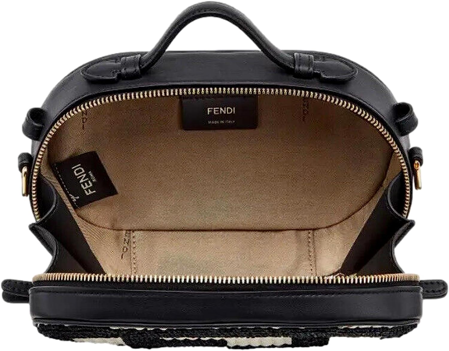 Model Number: 8BS059 Hand-Woven Raffia in Natural Tone & Black. Black Calfskin Leather. Woven FF Motif. Gold-Tone Hardware. Zipper Closure. Beige Canvas Interior Lining. 1 External Back Pocket.